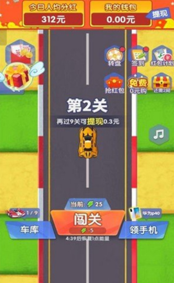1、驾驶豪车加入赛车竞技,通关得红包,看看你能闯多少关。