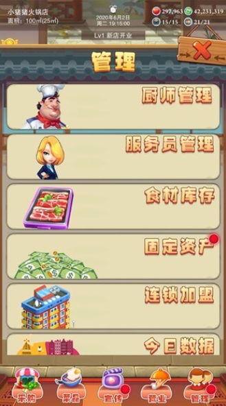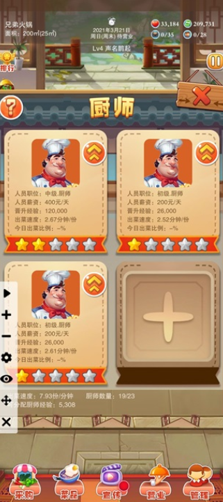 厨师负责出菜,若你发现火锅店的出菜速度极慢,则可考虑多招聘一些厨师或者给厨师升级