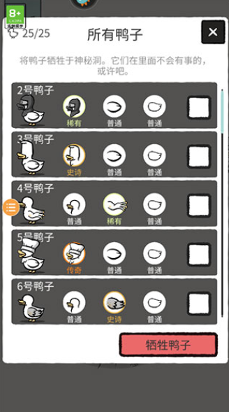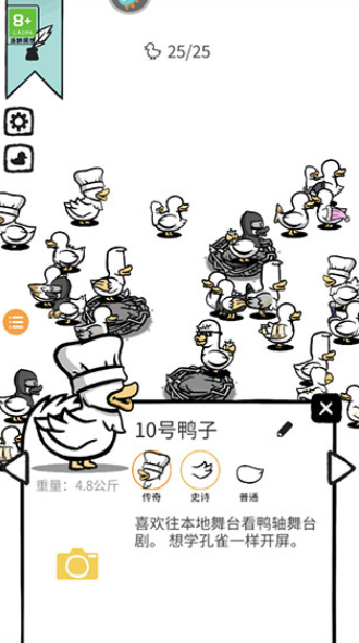 怪鸭世界无限召鸭版非常有趣的地方是每次孵化出来的鸭子都是不一样的,它们或多或少自身都带有一些变异在里面,有的头变了,有的翅膀变了,还有的长了胡子、带了头盔啥的...反正很多很多稀奇古怪的这里都有。对了,鸭子的数量是有限制的,而对于那些变异等级不高的我们可以选择将其丢进黑洞,当丢弃的鸭子达到一定数量后黑洞会给我们一个黑化的鸭蛋,将它孵化出来后就能够得到一个黑化变异的鸭子,不过长得有点丑。哈哈。玩法还是非常治愈的。