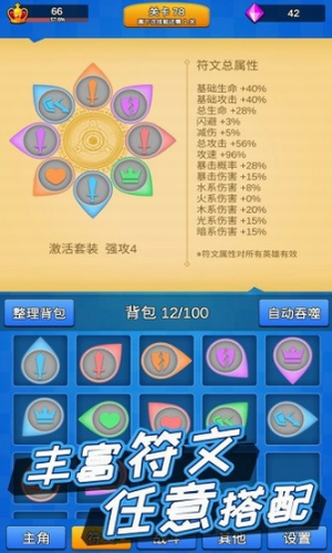 大量不同的角色等待玩家的尝试选择,在不同设计的关卡中选择不同的角色进行搭配,自由组合,还有随机属性让每个角色都能得到不同的发展潜力,秦刚简单的放置玩法,任何玩家都能快速上手。