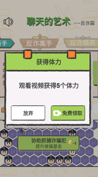 聊天的艺术游戏无限体力版是一款非常棒的模拟防诈骗休闲手游,游戏中包含了非常丰富的内容和各种有趣的玩法,玩家通过不同的剧情问题挑战关卡,多种有趣的问题,只需要玩家以谈天说地的形式下就可以完成挑战,内容非常魔性高搞笑。在聊天过程中我们也可以学习到很多防诈的小知识,感兴趣的小伙伴快来下载体验吧!