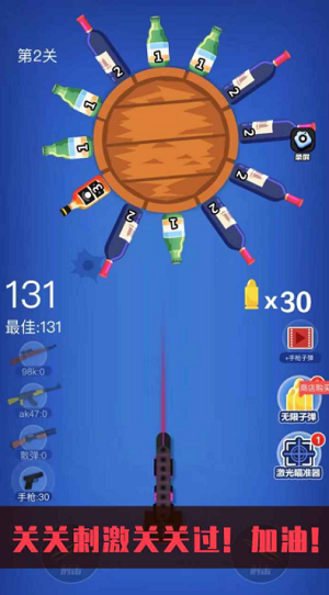野人神枪安卓版是一款超级好玩的休闲游戏,玩家无需瞄准,只要掌握好时机即刻,游戏采用卡通的3D画风,玩家需要找准瞬间击碎飞跃而出的瓶子就可以得分,您击中的瓶子越多,分数也就越高,分数可以去商场购买不同的武器,每把武器有自己独特的特点。