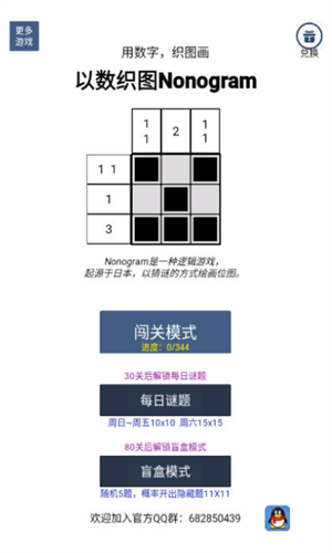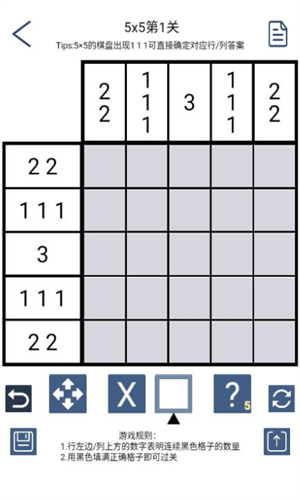 在一个网格中,每一行和列都有一组数,玩家需根据它们来填满或留空格子,最后就可以由此得出一幅图画。