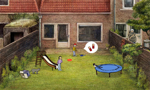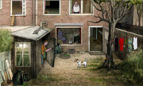 点击左侧小屋的门,狗走过去叫了几声,门打开,点击酒瓶,给楼上的大叔,大叔喝完酒将酒瓶扔下,点击啤酒玻璃碎片,狗走过去叫了两声