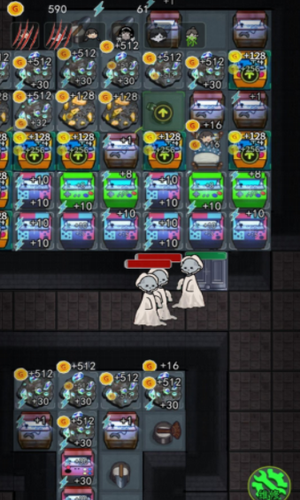 2、鬼在熄灯后疯狂袭击宿舍门,玩家要升级炮塔,购买强力武器,与猛鬼对决。