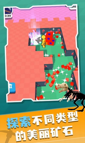 1、卡通的画风使您轻松愉快,挑战不同的挖掘任务,并挖掘更多的宝藏,成为一个完美的矿工。