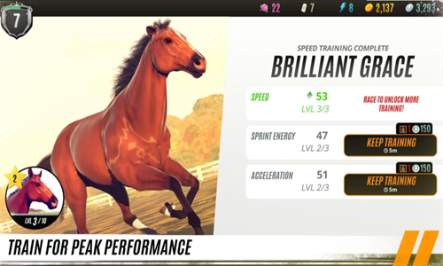 但是赛马过程能展现的技巧并不多,马儿有速度、爆发力、加速3种属性可以升级,多花点钱和精力升级才最重要。本质上,这是一款收集和培养爱驹的经营、养成游戏。