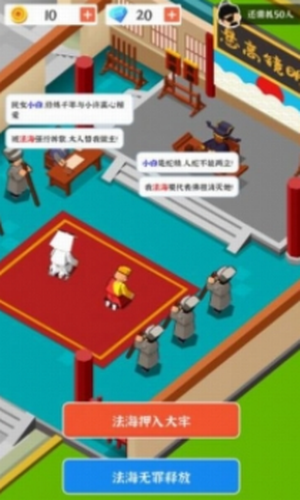 画面看上去萌萌的,玩家纯靠判案来升官,而且判错案还会降阶,各种奇葩案件等你整理,发现各个线索正确判案升官,体验当官老爷的乐趣。