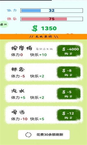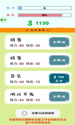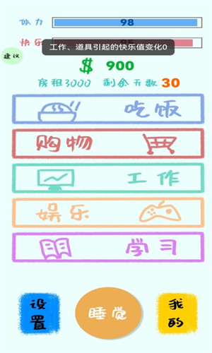 2、玩家需要在30个回合中赚取生活费,让自己活下去的同时攒够下个月的房租,希望大家喜欢。