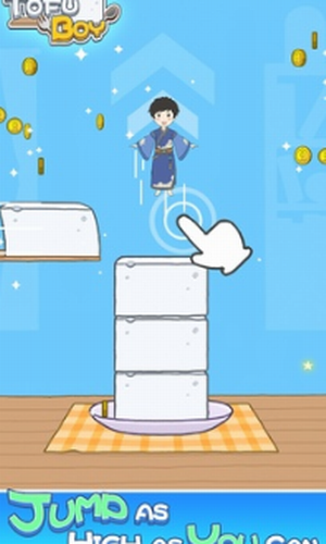 灵活的跳跃闯关,一定要保持小男孩的身体平衡,不要东倒西歪;豆腐男孩破解版是风格非常清新的跳跃手游,玩法上与豆腐女孩差不多,只不过这一次的主角变成了男孩,数十种全新的形象等你来解锁,点击就能控制男孩跳起来,将豆腐块叠在脚底下,到达50层、100层等特殊数字时会有惊喜彩蛋,玩家在游戏中将控制一个小男孩不断的进行跳跃精准的落在豆腐上让豆腐越叠越高,成功闯关后就会进入下一个关卡。虽然游戏听上去非常的简单,但是实际操作中玩家会遇到各种各样的困难不过相信玩家可以成功的克服这些困难。