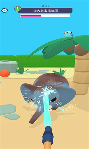 3、拖动水管对准小象身上的泥巴部位,就可以冲洗干净啦!