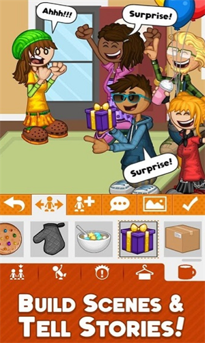 创造伙伴只是开始!结合你的伙伴与风景,文字泡沫,和道具安排自己的自定义场景。你可以在场景中放置你喜欢的任何地方,并使用手势旋转和调整大小。为每个角色选择各种各样的姿势,并改变他们的面部表情以符合他们的心情。你可以在你的场景中使用各种各样的背景来帮助你讲述你的故事,以及你的朋友可以掌握的几十个道具。如果你的朋友有话要说,你也可以添加文字气泡和字幕到现场!