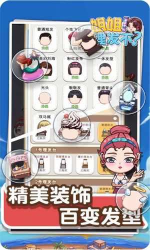 2、游戏玩法丰富,趣味十足,解锁不同的顾客、店铺装修和新鲜发型。