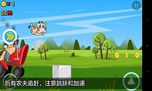 奶牛快跑破解版是一款休闲类游戏,小奶牛已经逃离大农场,可是农夫开了货车已经拼了命追捕她们,你必须利用武艺逃离农夫的追捕,应用弹跳和滑跑来越过阻碍,解救大农场的动物们,一路上障碍重重,还有农场主开着车在身后穷追不舍。游戏操作简单,几个简单的按钮用于控制奶牛上窜下跳。连续点击跳跃键,奶牛能蹦老高,不过下落需要的时间也长,需要酌情使用。