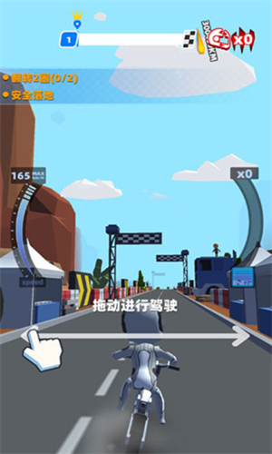 1、通过点击屏幕实现驾驶,左右移动可以控制摩托车的方向,遇到加速条尽量往上靠,同时还有时刻注意前方的路况,因为一些路况上还有陷阱。