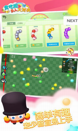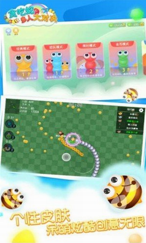 2、贪吃蛇多人大对决超q萌清新画风让你爱不释手,源源不断的小蛇皮肤全部开放供君选择。