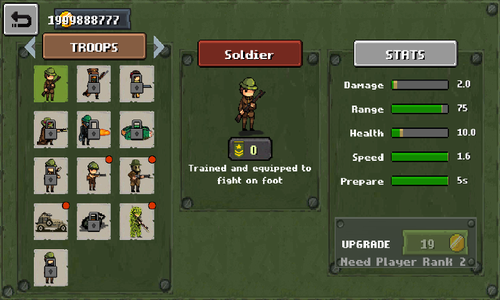 1、提升军衔以解锁新的军事单位,包括突击士兵,军官,喷火器,狙击手,火炮,机枪手。