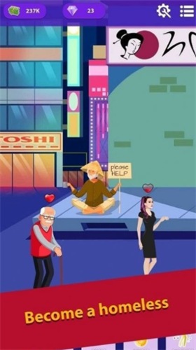2、一开始你必须乞讨,但在这个游戏中你可以通过购买和更换流浪汉风格的衣服来赚取额外的钱。