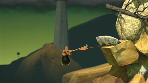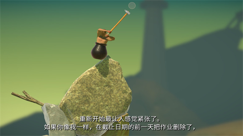 3、玩家控制一个坐在似乎是缸里的人,用一把榔头不断往上爬,操作极其简单。