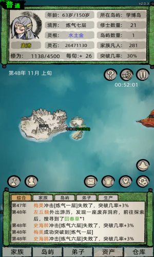 修仙家族模拟器5.0破解版是一款修仙风格的模拟经营游戏,在游戏里你需要经营一个修仙家族进行炼丹,炼器,修行等,使你的家族变强。修仙家族模拟器游戏开局会给你一个主角和另外两个族人,还有一个初始岛,值得一提的是,这个游戏里人物的天赋是随机的,有非常多种。游戏里的各种按键功能还是比较多的,小编我也是花了很长时间才搞懂。一开始的时候,没有种子和材料,可以先让族人去挖矿,同时让修为最高的主角出去探索,探索可以获得一些灵草种子、装备,还有一些材料,这时候随着时间的推移,也有了不少新族人加入,就可以让他们去种灵田、炼器、炼丹了。玩家将扮演家族老祖,带领族人开辟荒岛,合理分配弟子,使资源得到有效利用,培养家族麒麟子,更多有趣玩法等你解锁,喜欢的朋友快来下载了