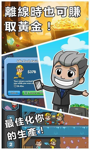1、游戏操作简单,点击矿工自动采矿,招聘经理可以监督矿工的工作。