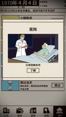 说实话,这个游戏难度挺高的。很多时候,你经常会因为生意不顺、资金不足,导致缺少医疗费,最终造成父亲死亡。所以,我们不能盲目地扩张事业,需要谨慎些,时刻保持手头有充足的资金。