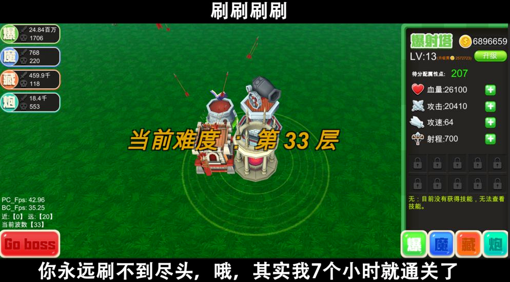 2、魔塔:伤害能秒杀,射速也够,射程也行,血量因为旁边有爆塔,也不怎么掉血(先死都是死的藏塔,然后才是魔塔),这塔主要是前期靠中期才起得来,伤害点到秒杀当前怪物就行,然后就一直加射速就ok,很强,后期刷怪贼快。