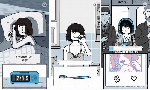 故事的主角叫弗洛伦斯,故事最开始的她和许多普通女孩儿一样,每天早上在闹钟的轰炸中爬起来,顶着乱糟糟的头发刷牙,在公交车上戴着耳机一边听歌一边刷朋友圈,然后进入公司开始对着电脑工作,循规蹈矩又平凡常见。