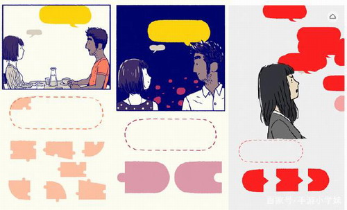 这款游戏的风格有点几米绘本的味道,也是吸引小编的原因之一。但它出色的不仅有风格,还有独特的交互方式。游戏中几乎没有什么文案,基本上是靠交互来推动剧情。比如两人交谈的时候,玩家需要将对话框拼起来。两人刚开始接触时的对话框拼片很碎,表现出交流中小心翼翼的试探,而越往后走两人越来越有默契,对话框的拼片也就越来越大,越容易快速拼好。而两人发生争执时,对话框的拼片则变得尖锐,颜色也变成刺眼的红色。