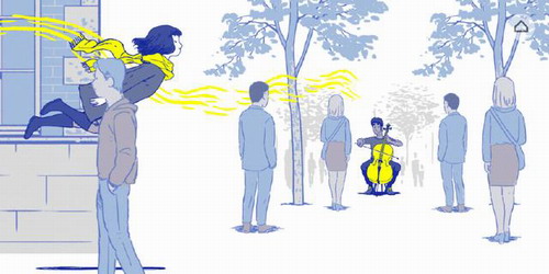 弗洛伦斯的生活是从什么时候发生改变的呢,就是在遇见他的时候。那天走在街头的弗洛伦斯用完了手机里的最后一格电,不得已摘下耳机,正是这个契机,一段美妙的旋律钻进了她的耳朵,那时他正在街头另一边拉着大提琴。这个相遇实在唯美,当弗洛伦斯随着音符起飞的时候,小学妹就知道,是爱情来了。