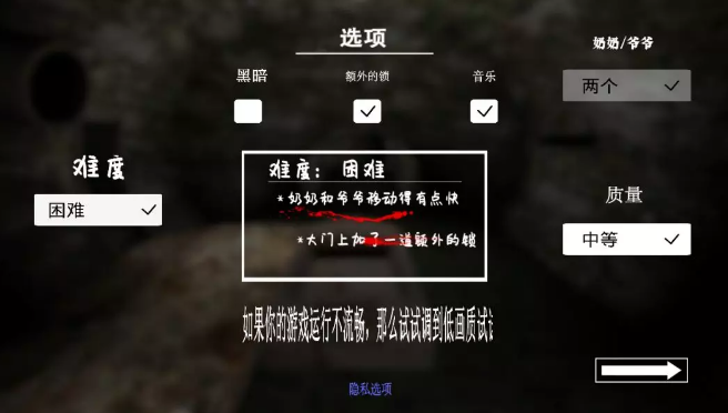 恐怖奶奶2中文版欢迎来到奶奶:第二章。还记得去年打得各路玩家屁滚尿流的那个恐怖奶奶吗?上次逃出去之后又被奶奶抓回来,她感觉自己一个人看不住我,所以她找来了爷爷一起。这一次,奶奶不是一个人在战斗。为了活下去你必须试图离开他的房子,但要小心和保持安静。奶奶像往常一样能听到一切。爷爷听不太清楚,但他下手很重。如果你在地板上扔东西,奶奶会听到它然后会跑过来。你可以藏在衣柜里或床下。你有5天时间,并且有两种方式来逃出生天,你可以选择坐船逃跑,或者从正门逃跑。万事小心!