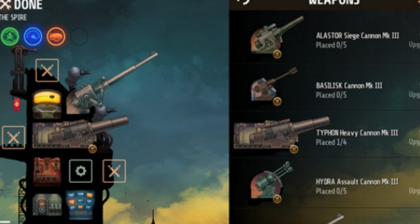 游戏中有多种不同的武器出现,玩家可以在不同的房间布置这些武器,让它们攻击敌军的飞空艇。城堡和武器都可以升级,让玩家可以面对更多更强大的敌人。