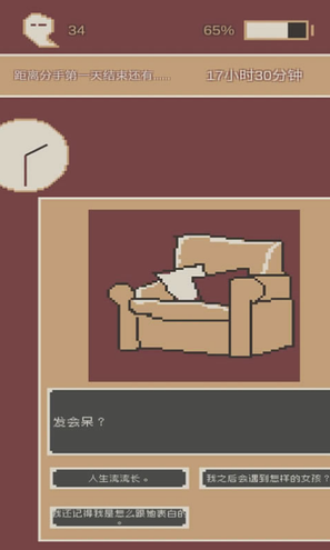 3、是很简单的剧情游戏,打出一个结局来最多不超过10分钟,剧情走向也很简单,一个失恋的人24小时的动向,分支选项也可以接受
