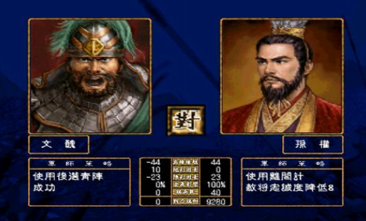 一切准备就绪,便进入了战场画面。战斗的方式和一代没什么不同,玩家只需按照游戏中的战斗指令,对自己所控制的部队进行指挥,同对手进行周旋。选择出战的武将首先要注意对手的出战武将,视其所带兵种是否会对己方的出战武将所带兵种相克;其次要知道对手的武将技的种类以及智力和武力的强弱;然后再视对手所排的阵形决定我方将使用的阵形;对武将技或军师技要擅加利用,因为游戏初期武将的能力普遍较弱,而后期的敌人又相对较强,所以,这些招式可是获胜的关键。当然,战况若对本方不利时也需考虑退兵以保存战斗力,借机与其他部队合流再与对手周旋从而取得最后的胜利。