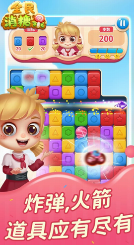2、会不定时的掉落各种炸弹或者糖果等等道具,能够一次性全部消除,赢得更高分;