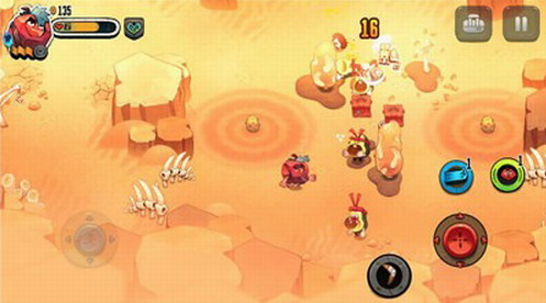 8、颇有难度的boss战,极大增强了游戏乐趣,第一个boss需要利用地形上的爆炸蘑菇,将boss引到蘑菇旁,利用蘑菇爆炸将boss击晕后方可造成伤害。