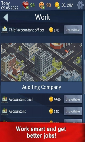 引导游戏人物成为百万富翁,摆脱贫困,业务模拟器无限金币版是以卡通风格设计的模拟人生成长的游戏,在这里玩家将扮演一位穷小子从人生的第一份工作开始努力,抓住各种机遇进行创业,走向人生巅峰,游戏的设计极具戏剧性,不过也尊重了部分现实,让玩家能够感受到创业的艰辛与成就。到第一份工作,爬上职业阶梯,学习如何有效地组织时间。看看奢华的生活方式,花钱买昂贵的汽车,房屋和直升机,时髦的西装,不要胡闹,取得成功,更好的成长自己,让自己成为一个真正的成功人士