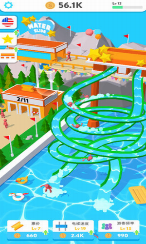 2、玩家可以升级自己的游乐园等级,票价等级,电梯速度等级,游客频率等级。