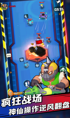 抢夺更多的旗帜快速的获取到游戏竞技的胜利,夺旗大乱斗无限钻石版是一款线上的多人竞技游戏,游戏的规则非常的简单容易上手,游戏的模式也很轻松,一局游戏能很快结束,在游戏获得的金币可以用来解锁更多更强大的武器,游戏中玩家需要通过匹配进行较量,在匹配到对手后根据已有的机器人进行排列,在这里每个机器人都有自己的技能与战斗定位,合理分配好每个机器人的位置将成为你胜利的关键,通过不断的摧毁敌人占据旗帜,获得游戏胜利
