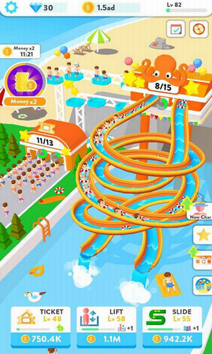 游戏中每一个地图会给玩家不同的乐趣,放置水上滑行破解版是一款非常不错的趣味休闲放置水上滑行系列游戏,游戏中玩家能体验到经典的休闲滑行冒险世界的完美乐趣,多种不同的趣味游戏内容,你只需要在游戏中不断的升级你的游乐园就好了,游客们会在滑滑梯上自己玩耍,你可以收取门票来赚钱,赚的钱多了以后,你就可以继续升级游乐场了。打造你的水上世界的模拟经营放置游戏,非常简洁的卡通游戏画风等你体验,你可以自由的建设你的水上滑道