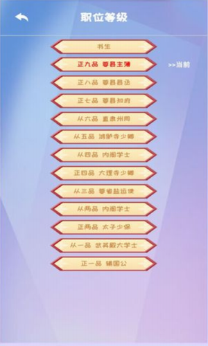 1、玩家从书生角色开始、慢慢积累自己的政绩来提高职业的等级;