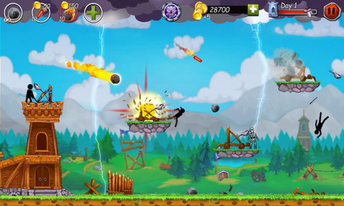 我们的火柴人战士拥有全新武器和大量防御手段,火柴人之守卫城堡2最新版是一款塔防题材的火柴人游戏,游戏玩法有趣,游戏中玩家需要操作火柴人进行战斗,守护城堡不被敌人攻击,非常的有趣,游戏中玩家的任务就是保护自己脚下的防御塔不被摧毁,游戏操作简单轻松易上手,轻轻滑动屏幕就可以调整投石机的投射角度,注意瞄准,去攻击其他平台上的火柴人,将对方的防御砸毁,为了打击敌人的战士并抵御围攻,不断更新和发展你的城堡