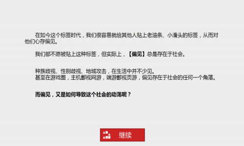 3、各位玩家在玩的过程中,如果有一些想说的,或者从游戏中产生了一些感悟和感慨,可以在论坛进行留言和评论,让我们大家一起来探讨这个深刻的话题——偏见。