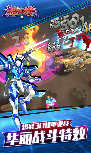 1、爆裂飞车3D机甲变身,华丽战斗特效。让你在关卡中尽情挑战,畅享打击