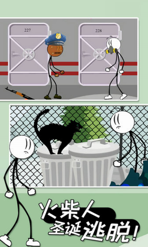 游戏设置了多个谜题,需要你一个个的来解答,火柴人圣诞逃脱无限提示版是一款以圣诞节为主题的解谜冒险手游,而在这款游戏中的角色就是非常经典的火柴人,这样的好处就是使得游戏中的画面看起来更加的简单简洁,当然在玩法上也是非常简单的,玩家需要在游戏中避开巡逻的人,以及各种障碍物和陷阱,需要你去细致的思考,解开游戏场景中的很多谜题,让你可以成功的逃离,寻找到最终的出口,整个游戏的玩法十分的休闲,是一款很不错的手游,游戏画风简洁,玩法易懂。玩家需要运用智慧,避开巡逻人员和各种陷阱,解开各个场景中的谜题,成功逃离出去。游戏关卡丰富,而且挑战性十足