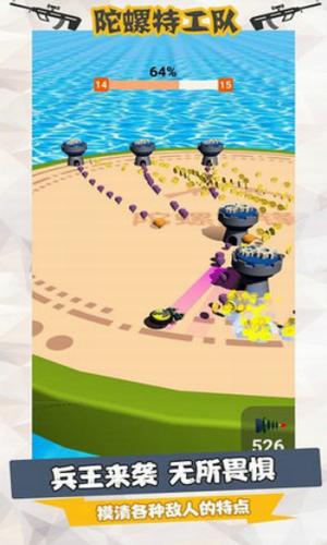 陀螺特工队游戏中有多种陀螺,陀螺特工队破解版是一款竞技对抗类的陀螺射击游戏,陀螺特工队中玩家可以选择心仪的陀螺样式,在缤纷的战场中冲锋陷阵,迎接前来进攻的强敌。你可以自由的购买装备道具,还能解锁更加强力的史诗陀螺种类。根据不同敌人的特征制定不同的战斗攻略,还能在不同的特效加成中获得更加强大的攻击能力,驱使强力的陀螺武器在关卡中闯关夺宝。游戏中有着数十个挑战关卡,并且有着上百种特色武器道具。不管是简单的触控操作还是可升级的陀螺装备,你将获得最顶级游戏对战享受
