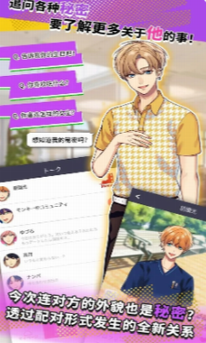 当两人关系发展到一定程度,单靠讯息已经不能满足的时候...!秘密短讯开始啦中文版是一款恋爱类型的角色扮演游戏,一条短信过来,你似乎不认识他,但聊天认识一下似乎也很有趣。你和他的关系,由你的态度来决定,想要一场属于自己的爱恋,想找到一个自己喜欢类型的恋人,采用了短信互动的玩法,在这里玩家需要通过短信来与多个不同的美男进行互动,每一个角色都能触发不一样的故事结局哦,你将会在多个美男中选择哪一个呢?