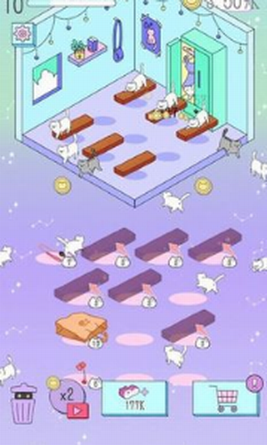1、得到一个全新的二次元小家,在这里投放家具,家具合成起来吸引新的猫咪吧;