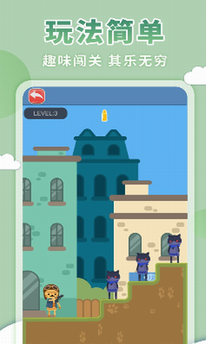 使用你致命的准确性和精确度来保持坏人!3D重力子弹先生无限子弹版是一款休闲益智类射击游戏。在这款游戏中你将扮演一只神射手小橘猫,在你前进的路上有许多障碍与敌人,无需多言,喵地把它们用枪统统扫射成渣渣吧!玩家将体验到一种全新的射击体验,带来一种不一样的特色感受,你需要开动自己的脑筋闯过每一个关卡,在规定的子弹数量内使用手枪击杀全部敌人,为了能节省子弹,你可以通过对场景地图的分析来进行不同角度甚至反射式的射击,使用的子弹越少那么获得的积分也就越高。