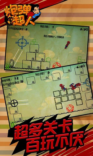 如何以最少的时间最少的弹药完成关卡是玩家最要琢磨的地方。炮弹超人中文版是一款十分简单的休闲益智手机游戏,游戏中玩家需要控制大炮来发射预先布置好的超人,发射并打击目标物,玩起来十分刺激带感,玩家需要遵循物理定律进行闯关,利用你的物理知识来突破难关,尽可能用最短的时间以及最少的弹药闯关成功,玩起来还是有点烧脑的,喜欢的小伙伴快来下载体验吧。
